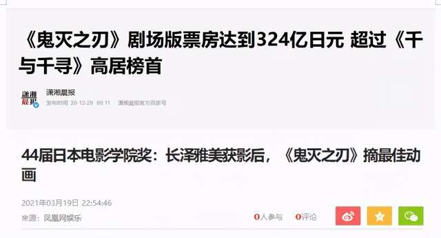 而之后的剧场版也在将这段传奇延续下去,动画电影《鬼灭之刃:无限列车篇》在日本国内累计票房已经达到了400亿日元上下,打破了2001年上映的《千与千寻》的316亿日元票房,日本国内电影票房榜首,并荣获第44届日本电影学院奖之“最佳动画”奖项---