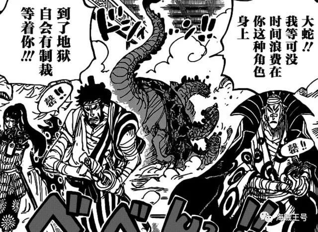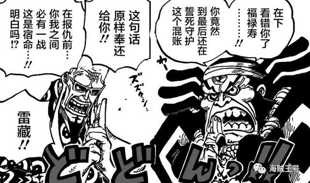 赤鞘武士斩杀大蛇后并没有全员离开,而是留下了雷藏断后负责与大蛇的忠仆福禄寿对决,福禄寿这个角色虽然看不出有多强,但却让人印象深刻,尤其是给他死心塌地效忠大蛇的行为更是让读者十分不理解,或许尾田会在后续剧情中解释他和大蛇的关系,但希望不要着重刻画雷藏和他的战斗,因为这俩人都说不是什么重要角色,人气也很一般,实在没有刻画的必要。