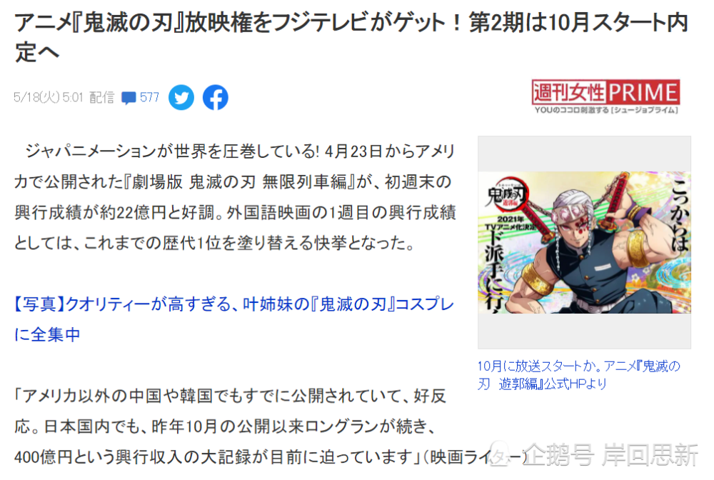 富士电视台的野心是从鬼灭剧场版上映前夕开始,它将第1季动画分成三个总集篇在黄金时段播出,结果平均收视率高达15%以上,而近年来,富士电视台收视率持续低迷,在五大商业电视网中存在感也在逐渐减弱,难得通过鬼灭动画获得如此自豪的业绩,它想拿下第2季动画首播放映权也是无可非议。