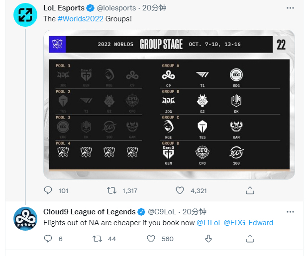 在分组结束之后C9战队作为一号种子也是喊话T1和EDG战队,称你们现在预定从北美回家的航班会更便宜,很多网友听完都表示C9战队太嚣张了,即便他们是一号种子也不见得他们实力多强,要是放在LPL今年都不见得能晋级世界赛,话虽然是这么说,但要给大家提个醒,C9这个队伍每年世界赛都不被人看好,可他们总能突破小组赛,问大家一个问题,如果有一个队伍小组赛第一轮全败,第二轮全胜并且拿下加时赛晋级八强,那这个队伍最有可能是哪个,只要每年世界赛都看得观众肯定会选他们。