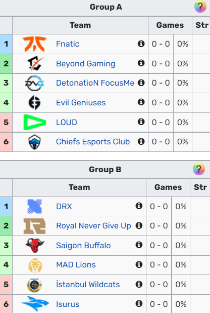 入围赛A组是欧洲3号种子FNC、港澳台联赛的2号种子BYG、日本赛区的1号种子DFM、北美的3号种子EG、巴西的1号种子LOUD和大洋洲的1号种子CHF。