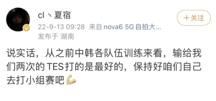 不过让人没想到的是,近日,JDG教练的一则微博却无形之中给TES上满了强度,引起了不少网友们的热议。该微博的内容是这样的,“说实话,从之前中国各队伍训练来看,输给我们两次的TES打得是最好的,保持好咱们自己去打小组赛吧!”从表面上来看,这句话似乎是在阐述TES在中韩训练赛中出色的表现,但实际上,这句简短的话却充满了一些不太好的影响。也或许是因为这句话的影响的确不太好,随后JDG的教练也删除了这条微博。