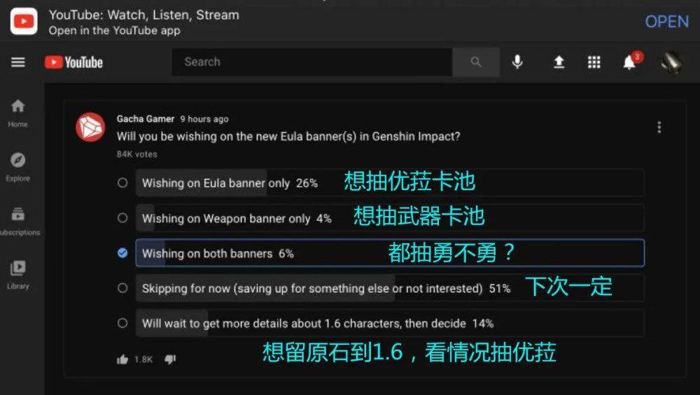 与国内玩家众口一致称赞优菈不同,对于这一《原神》新角色,国外的玩家却貌似不是很感冒,前不久油管主动态发起优菈卡池的抽取投票中,超8.4万外服玩家有51%不愿意碰这次的卡池,明确表明会抽的玩家仅占26%,不得不令人大跌眼镜,难道说国内外玩家的审美差异已经有了如此之高的分歧?