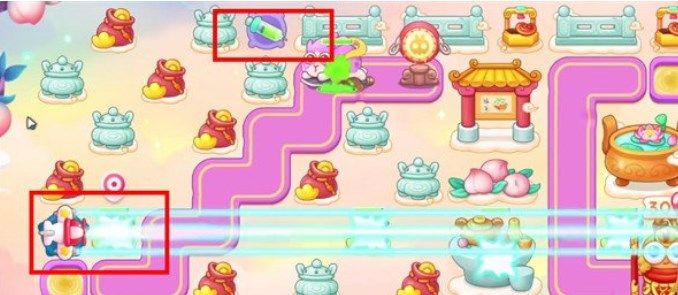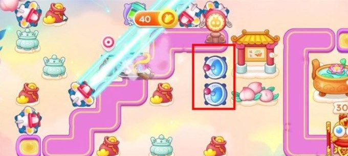 2.将毒针塔升到满级后,在下图位置放一个玩具飞机,锁定右边的钱袋;