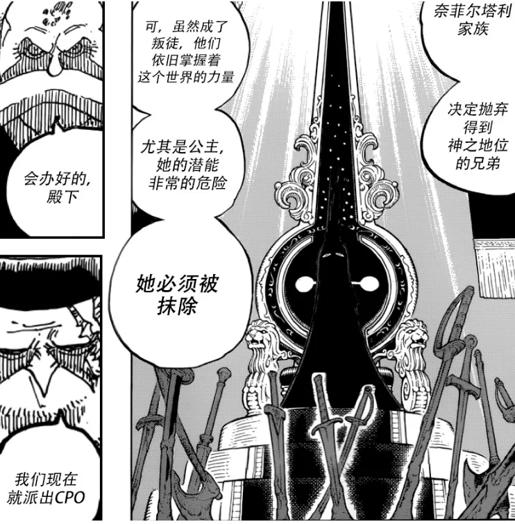 这说明,除了伊姆的权力滔天之外,在他的巨大权力下,世界政府已经掌握了能够瞬间消灭整个岛屿的武器,整个与众人期盼的古代兵器——天王,确实有着名字和想象实力上的接近,虽然在情报中,并没有给出这个摧毁整个王国的力量到底是什么,但是我们可以推断出,这种强大力量的背后,必然是一种与古代兵器有关的力量!