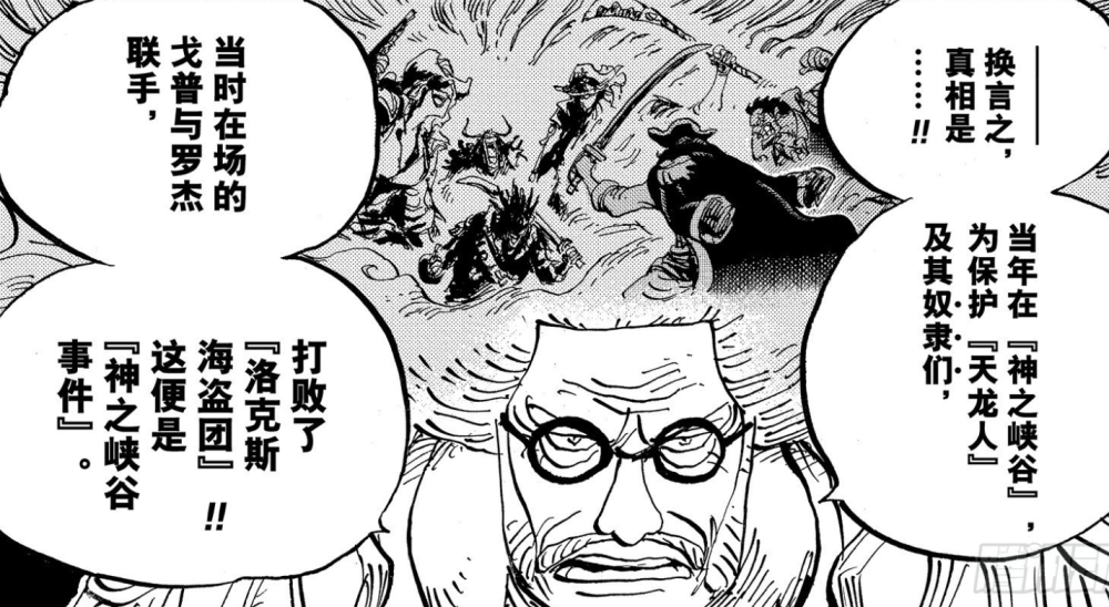 根据最新话的信息,让小蜘蛛瞬间联想38年前的【神之谷事件】,由海军卡普+罗杰海贼团对付同样想要成为【世界之王】的洛克斯海贼团,这场战斗彻底瓦解了洛克斯团,其船长洛克斯更是陨落。