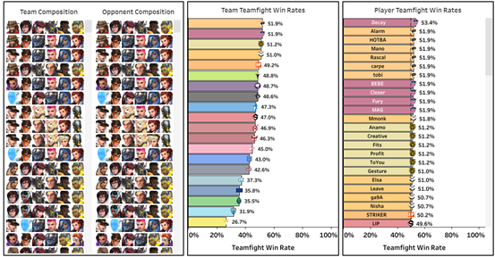 最后我们来看看五月锦标赛阶段常用的一些战术组合。麦克雷、美、D.Va、莱因哈特、巴蒂斯特、卢西奥是上个阶段使用率最高的组合,超过600次的团战使用率,平均胜率也达到了50%以上,后续使用率较高的战术组合里,我们都能看到猎空和安娜的身影,可见这两名英雄在当前游戏版本里的受欢迎程度,猎空作为突击手的泛用性以及安娜配合温斯顿的经典进攻套路屡试不爽。到了六月争霸赛阶段,各支队伍将会拿出什么样的战术组合,将会变得非常有趣。其中D.Va的呼叫机甲的伤害从50提升到250,是近期更新中最大的变化,使用率居高不下的D.Va有可能成为下个阶段的核心角色,各支队伍如何围绕着这一点做出新的战术部署令人期待。