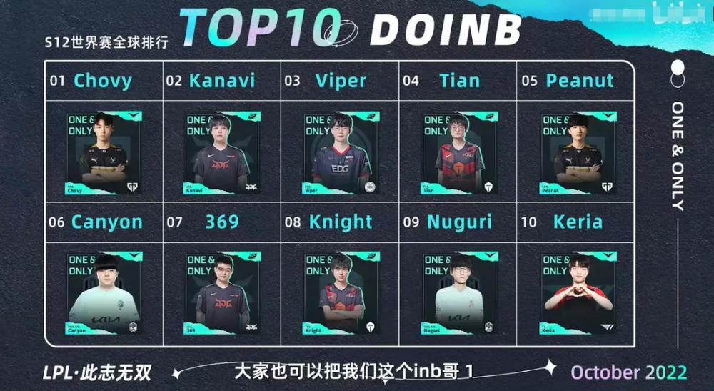 Doinb作为选手,也是参与到了这一次的评选当中,他给出的榜单就比较有意思了,chovy第一,Kanavi第二,viper第三,小天你第四,这个榜单里面,仅有小天、369和左手是国产选手,其余均为韩国人,不少网友也吐槽Doinb选的韩国人实在是太多了,难道国产选手就这么让人看不起吗?