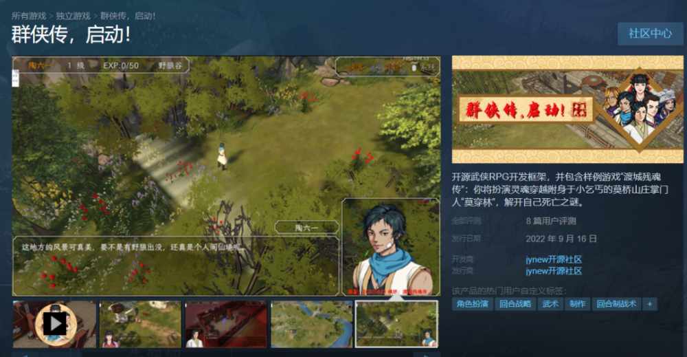 目前《群侠传,启动!》已经上Steam,包含一个样例游戏Demo“渡城残魂传”:玩家将扮演灵魂穿越附身于小乞丐的莫桥山庄掌门人“莫穿林”,解开自己死亡之谜。