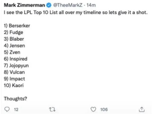 除了这位TL前教练的排名,LCK赛区也连夜发了两份新排名,一份是“s12世界赛前五阵”,其中一阵都是自家赛区的选手,包括zeus、peanut、chovy、ruler和lehends。要知道,doinb和管泽元选的第一还是LCK选手,他们评出来的一阵全是LCK队员?