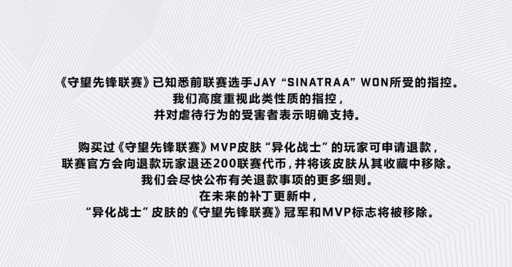但在当时sinatraa已经不是守望先锋的职业选手,暴雪的处罚措施为剥夺他的所有荣誉,包括选手定做的查莉娅的MVP冠军皮肤标识。
