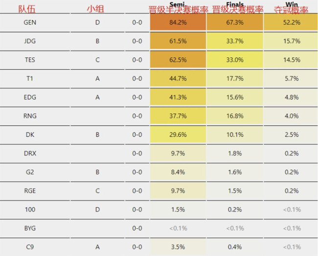 在晋级半决赛、决赛以及夺冠的概率中,GEN夺冠的概率为52.2%,遥遥领先位居榜首;而第二名的JDG夺冠概率仅为15.7%;第三则是TES,夺冠概率仅为14.5%;第四名T1夺冠概率为5.7%,EDG和RNG的夺冠率不足5%。欧美赛区只有G2、RGE、C9有望晋级半决赛,其他战队基本无缘四强。