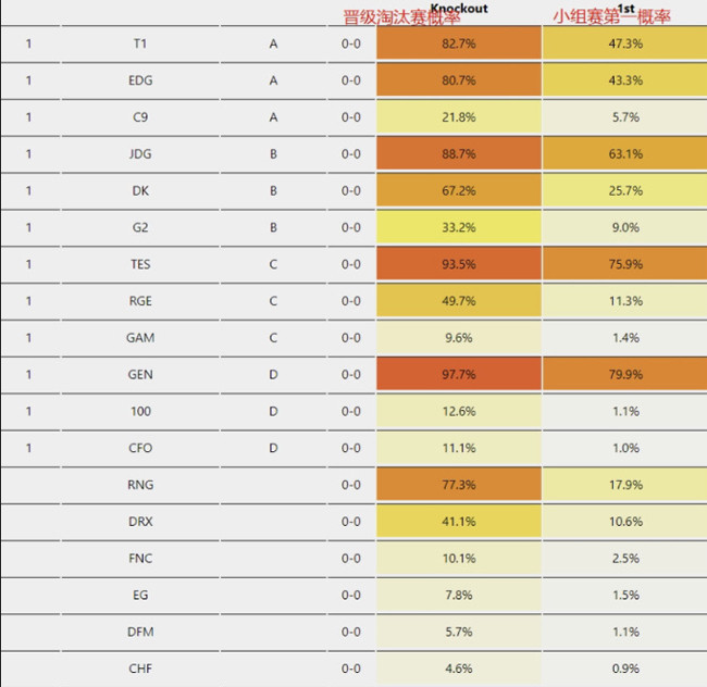 在小组赛晋级淘汰赛的概率中,A组T1与EDG的晋级概率最大(82.7%/80.7%),两队在小组第一的概率上也相差无几(47.3%/43.3%);B组JDG与DK的晋级概率最大(88.7%/67.2%),JDG小组第一的概率高达63.1%,而DK仅25.7%;