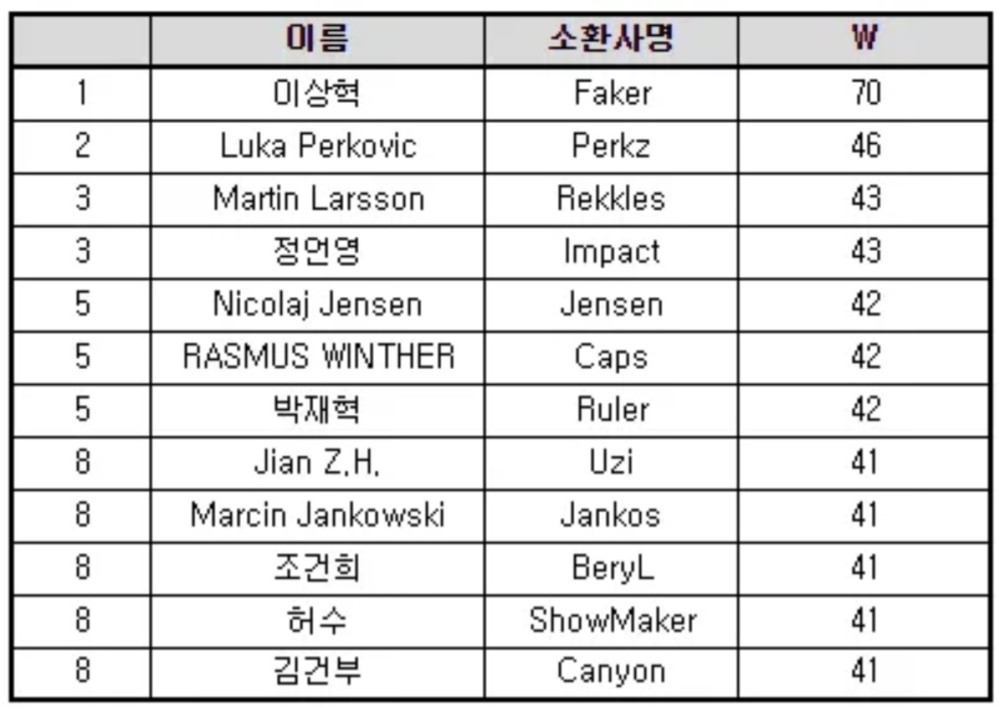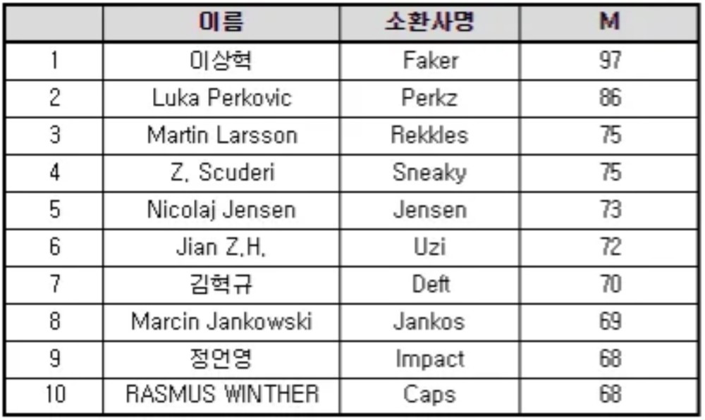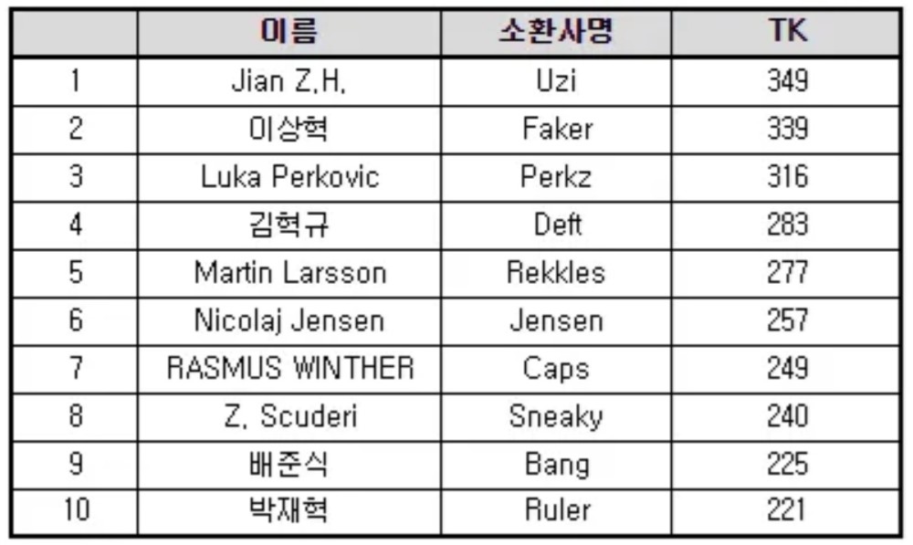 S12全球总决赛将会在北京时间的9月30日早上四点正式开始,在比赛开始之前会有各种各样的历史数据盘点与选手采访,其中有一个韩国网友公布的数据是引起了大家的注意,就是S赛历史击杀榜数据。