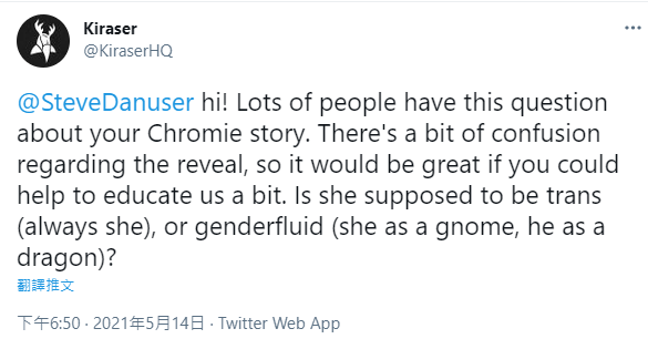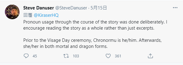 “在变身仪式之前,克罗诺姆是他。仪式之后,凡人和龙的形态都是她。”