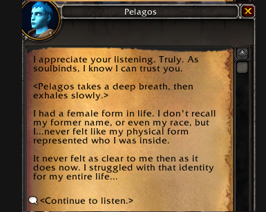 比如在魔兽世界去年上线的9.0版本中,晋升堡垒的重要随从角色裴拉戈斯(Pelagos)就是一名“前世为女,如今为男”的性转者。