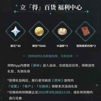 (4)发布得物X原神相关社区动态。奖励“冒险家的经验*2”兑换码礼包。