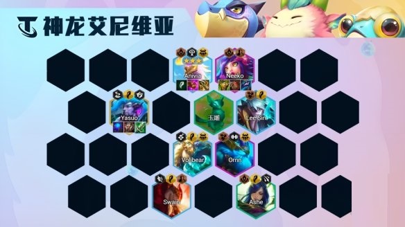 3阶段3-2升6人口找到6神龙3玉龙羁绊,直接将艾尼维亚顶在前排。尽可能找到2星艾尼维亚,保证在前期的坦度,没有3半神献祭之前艾尼维亚的坦度会差一些。