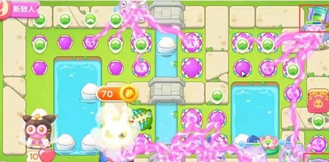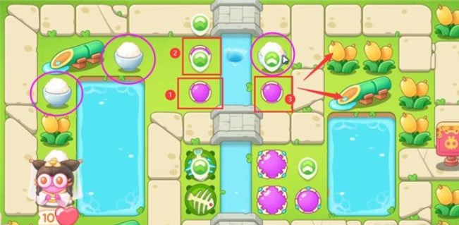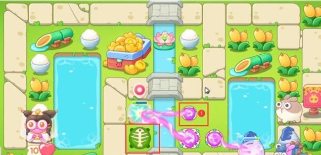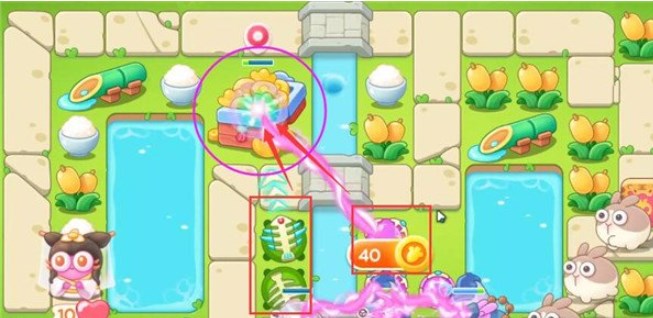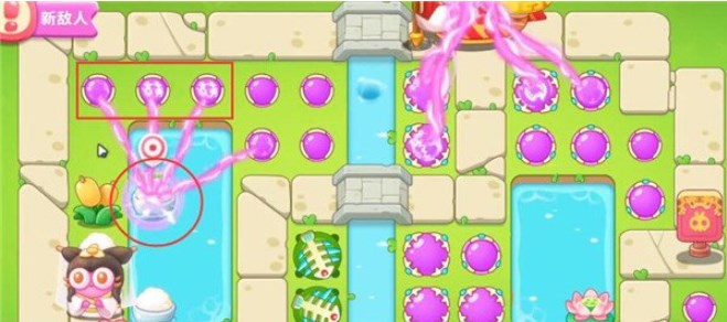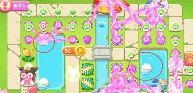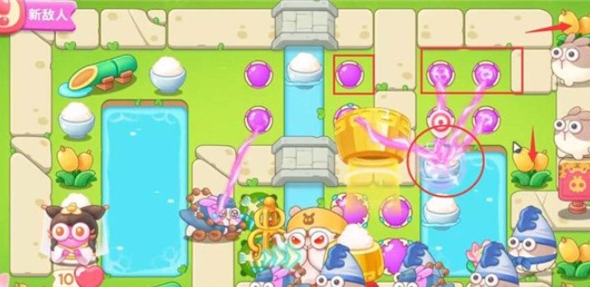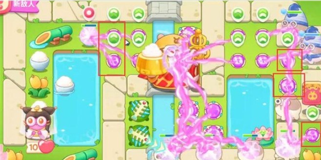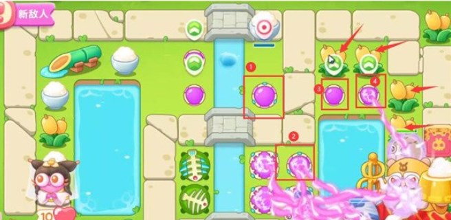 5、第四波开始的时候就把序号1魔法球升级,打掉米饭,接着放置序号2魔法球,右边图开出来后再放置两个魔法球,同时这两个魔法球接着打附近的道具。