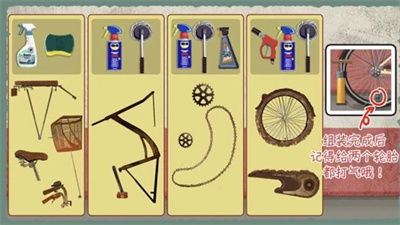 1、进入游戏之后首先将自行车的部件全都拆下来,然后再进行清理;
