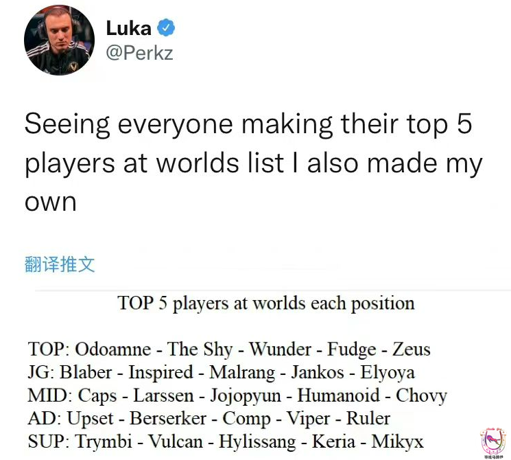 这个人就是Perkz,早年G2起家时的核心中单,也是G2嘲讽风格的奠定者,8冠欧洲1冠北美,欧美跨赛区荣誉层面的第一人。虽然今年他所效力的VIT最终无缘全球总决赛,但这每年最大赛事的热度不能不蹭!所以他也是效仿其他人搞了一个全球各位置TOP5,结果仔细看看这份名单可以说是相当逆天了!只要是能看得懂的,甚至已经不能算是整活了,而是纯粹有点恶心人了,一起来看看吧!