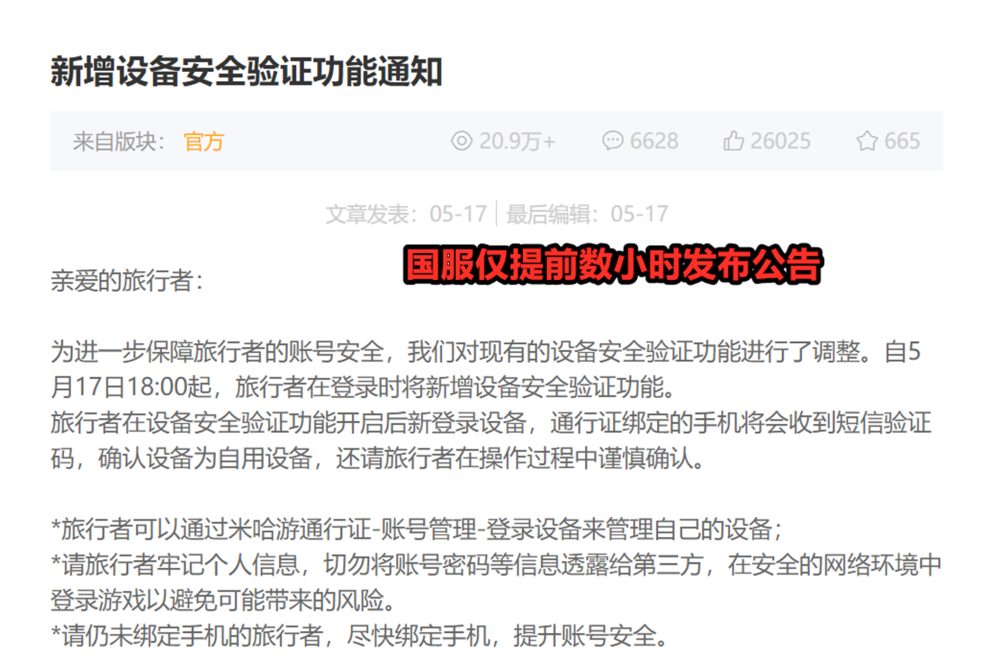游戏开服这么久,中途新增安全验证,结果就给玩家几个小时的准备时间?这件事不论从哪个角度来看都是个没有经过深思熟虑的决定。若是不出名的小众游戏制作者,这么做情有可原,但出现在《原神》这儿,只能说是一个重大的失误了。