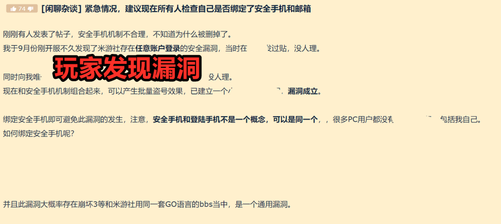 简而言之,有玩家发现了米哈游的漏洞,很可能导致玩家被盗号,但因为这样那样的原因没有得到处理,最终真的导致大量玩家被盗号了……