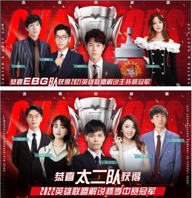 众所周知解说杯是由LPL的众多知名解说、主持人、退役选手以及各大平台的主播所组成的,目前解说杯已经来到了第三届也就是S3,而近期所举办的两次解说杯冠军得主第一次是由乘风儿所带领的EBG战队夺得,他们当时的五位参赛成员分别为上单王淞、打野雷霆、中单乘风儿、下路鲨鱼辣椒、辅助Kris所组成;第二次的解说杯冠军得主是由赵志铭所带领的太二队夺得,当时的五位参赛选手分别是上单iBack、打野赵志铭、中单Zonic、下路kinko、辅助余霜所组成。如今解说杯S3即将来临,究竟这7支队伍谁会夺得本届解说杯的冠军还得拭目以待。