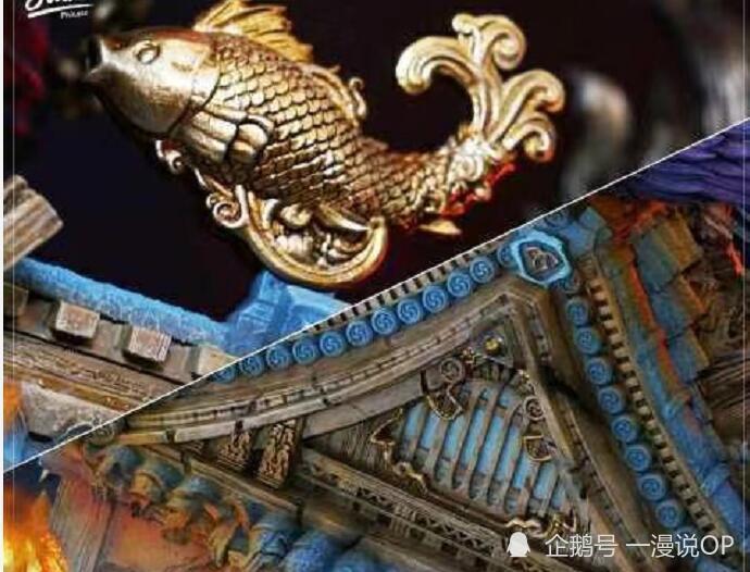 手办的整体造型也很大气,不仅有凯多的人兽形态展示,还有桃之助的加入,衬托的建筑物也比较大气,而且是细节满满。屋顶的瓦砾都很清楚地展示了,甚至是装饰的那条鱼,都能看清楚鱼鳞。