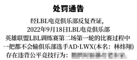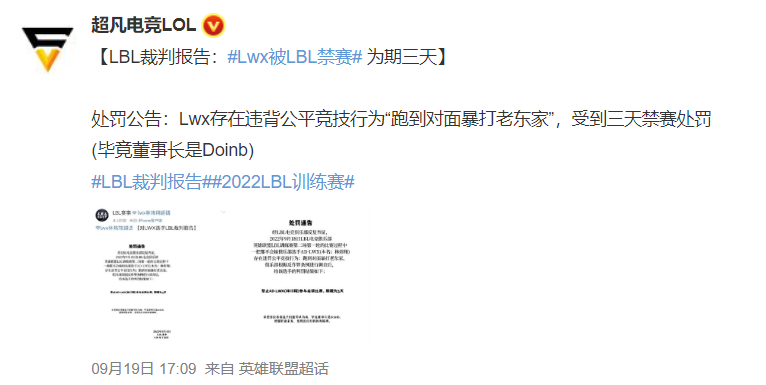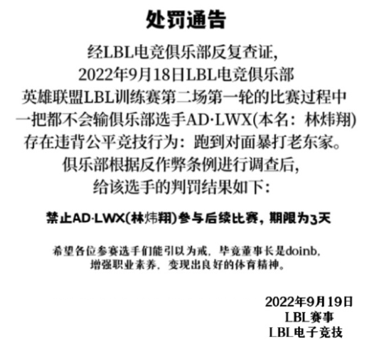 他的残忍,让LBL赛事破天荒地来了一张书面的处罚通知:因为跑到对面暴打老东家,AD·LWX被处以3天禁赛。