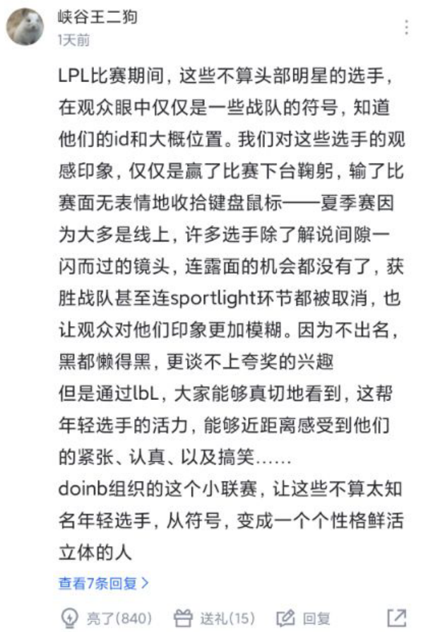 回想一下,在一场积分对抗的赛程中,一个个ID移动于游戏地图之上,依靠着数据与几张照片就可以架起路人观众眼中选手的一切。而LBL让他们得以展现出一个更立体的形象,这些不曾出现在比赛录屏中的内容,同样让不少观众欣喜。