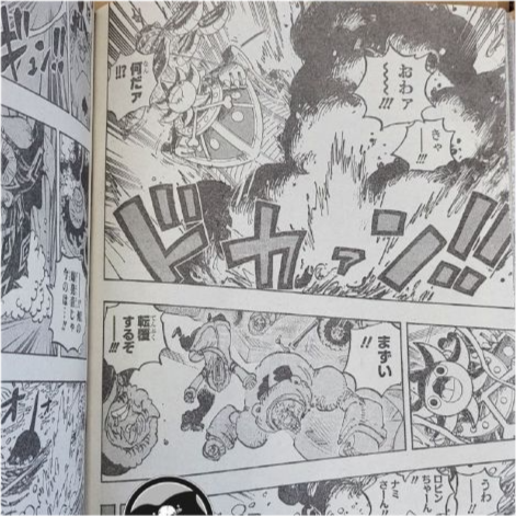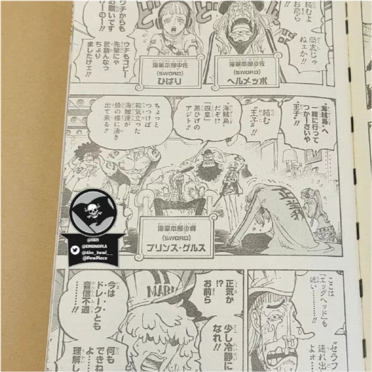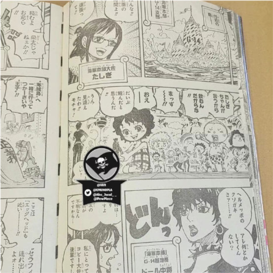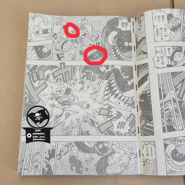 本话分兵的原因应该和庞克·哈萨德篇一样,从正侧两面来描述新岛屿上的情况。草帽团众人与贝加庞克遭遇,但有一个细节,本话的几个机器生物身上都有编号,鲨鱼是03,机器巨人是12。女孩的衣服上则写着02,显然女孩要么是机器人,要么是改造人,并不是真正的贝加庞克。