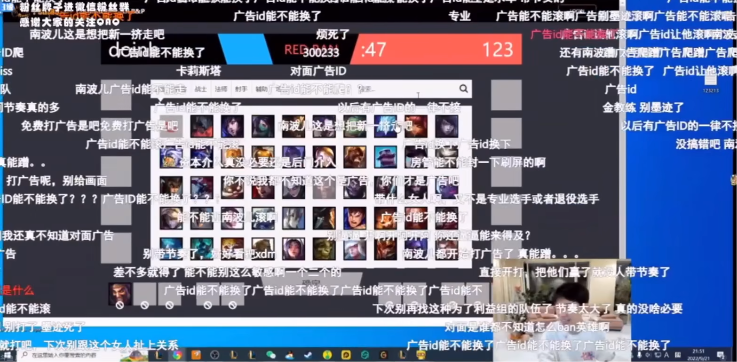 但让大家没想到的是,到了开赛的这一天,直播间里面来了一位不速之客,那就是南波儿,她表示自己想要一个OB位,来看看这一场精彩的比赛,但是当她进来之后,这一场比赛迟迟没有开启,而Doinb也发现了,对面有一个人的ID,竟然是一个广告ID,很明显就是故意拖延时间,然后在这个界面打广告,让更多的人所知晓。
