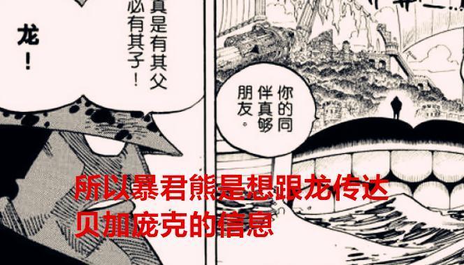 为什么这么肯定说,贝加庞克是革命军的人,这里有两方面的细节可以看出贝加庞克的秘密。首先,上一话的内容中,我们看到了暴君熊回归了革命军总部,而这时候的龙就问了暴君熊一个问题,你看到了什么东西。而暴君熊就回答说,如你所愿。这看似简单的对话,其实隐藏了玄机,龙应该是想要问暴君熊,在圣地中,贝加庞克对你做了什么,或者说,他有什么秘密告诉你?所以暴君熊才精准的回答,如龙所愿。