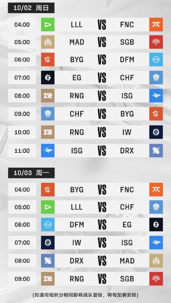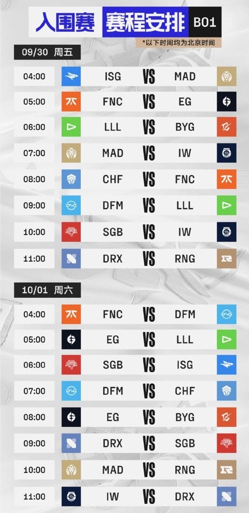 9月30日RNG对战LCK赛区DRX的比赛安排在了最后,时间是北京时间11点,如果前边的几场比赛时间拖得久一些,RNG的比赛基本就到中午了。接下里的几天里,RNG的比赛分别安排在10点、8点、10点、9点。需要注意的是,9月30日、10月1日、10月3日RNG都只有一场比赛,10月2日有两场比赛,时间是8点和10点,对手是ISG和IW。入围赛里,最值得收看的当属RNG对战DRX的比赛,大家不要错过。