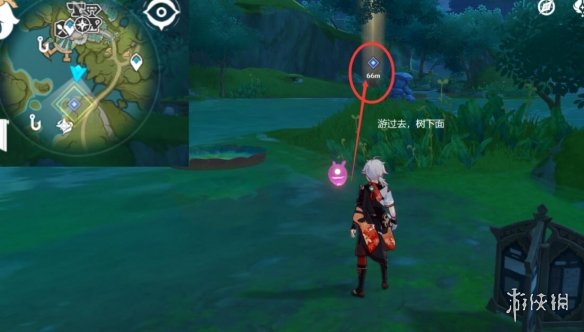 对话前朝着地图的南方向继续走,游过去到对岸,树下面光亮点,靠近触发对话即可完成。
