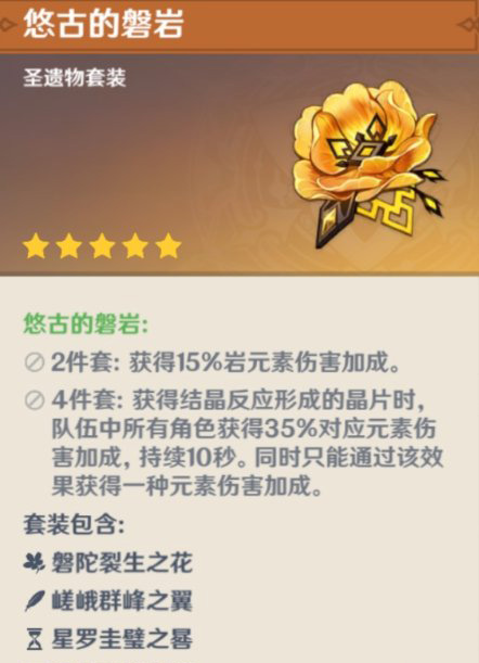 1、 4华馆防御力提高30%。 装备此圣遗物套装的角色在以下情况下将获得问答效果:在场上用岩元素攻击命中敌人后获得一层,每层问答效果会为队伍提供6……的防御力和6%岩元素加成。