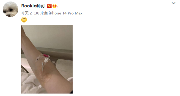 9月24日深夜,Rookie更新微博发布一张带有“留置针”的输液照片,并配上微笑的表情。