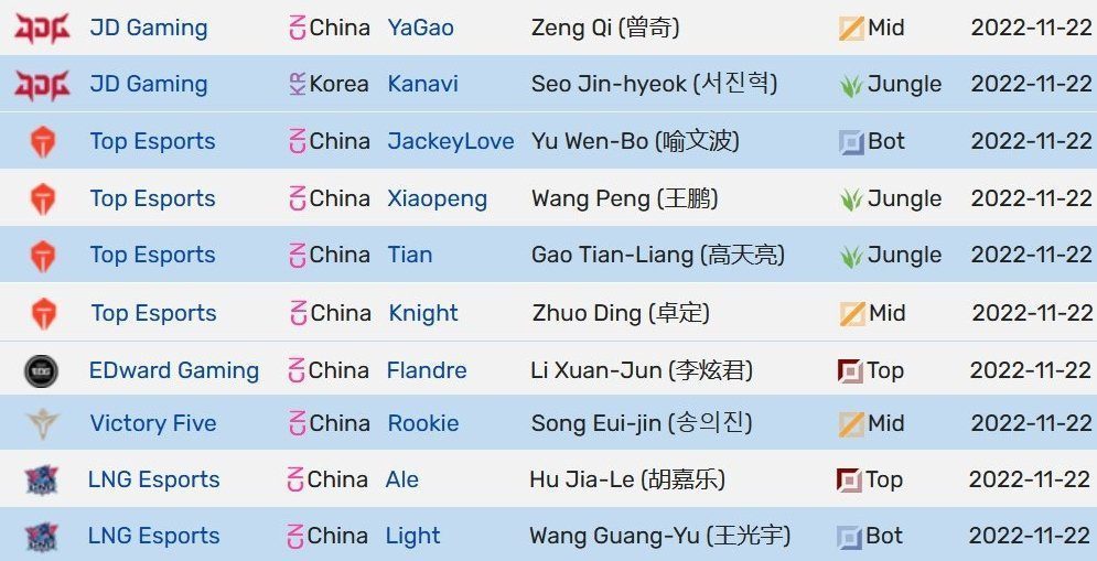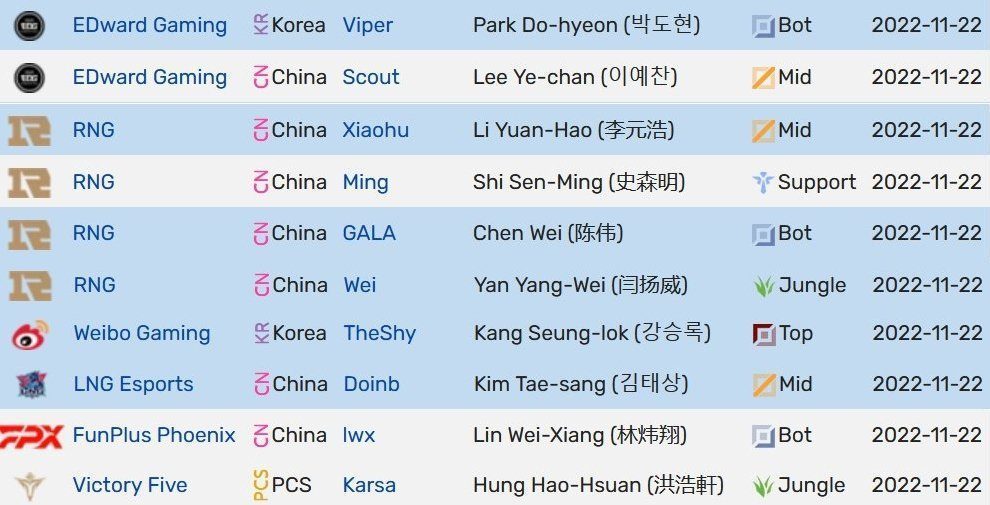 韩网统计出来的选手名单如下,JDG这边中野2人合约到期,TES则是JKL、小鹏、Tian和Knight四人合约到期,EDG是圣枪哥、Viper和Scout合约到期,之后评论区也有人补充Meiko也合约到期了。V5则是Rookie和Karsa合约到期。LNG是Ale、Light和doinb合约到期。RNG是小虎、ming、Gala和wei合约到期。WBG是theshy合约到期。FPX是lwx和clid合约到期。