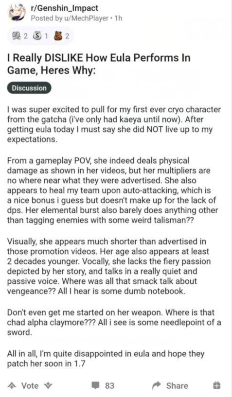 这也一定程度上体现了玩家的对优菈的喜爱。而在大家快乐抽优菈的时候,我在外网闲逛,遇到了一个有趣的“控诉”。说的是“优菈”表现与预期不符。