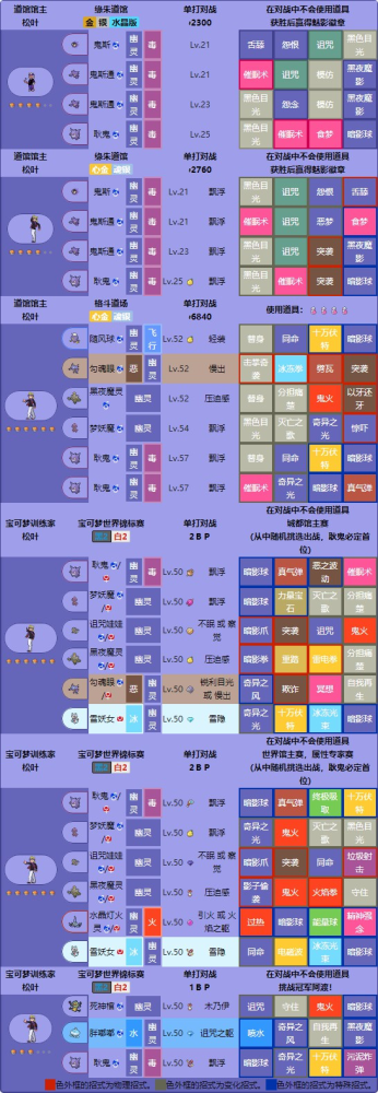 松叶最初不在道馆,他和水京一起在烧焦塔调查凤王卫队。在道馆中战胜他可以获得魅影徽章和招式学习器30(暗影球)。