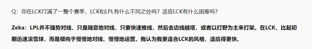 Zeka这位选手当初一直被誉为LCK赛区的中单兴起之秀。当初在加入BLG前,金教练更是钦点他并大力培养他。不过他在LPL赛区的一整个赛季来看,没有任何的亮眼表现。之前被人吹捧的压制力和天赋,在LPL赛区根本不够看。正因如此,BLG在花费大价钱引入后最终也只能放他回到韩国。可是他在最近的采访中,对于LPL赛区表达了轻视的看法。