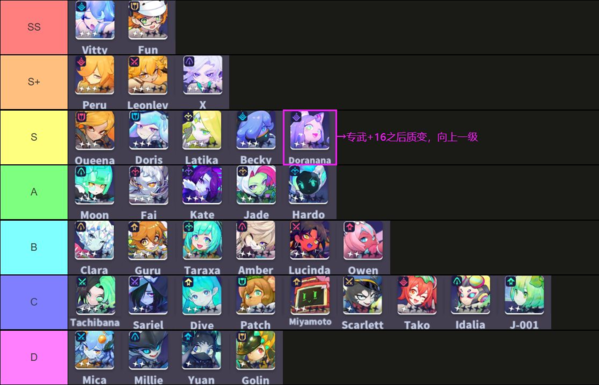 奈奈专16前和专16后基本上属于两个角色。推荐大家开服优先把她的专武升到+16,才能解锁她的完全体——也就是开局满充,可以直接放大招。奈奈的核心就是她的大招召唤的噜噜——一只大猫。这个大猫可以继承奈奈的全部属性,战斗力非常夸张,并且能造成群体击飞(专16后出场时)以及单体击飞(被动),还能瞬移到对面后排(被动)。召唤出来之后基本上等于场上多了个又肉又能抗的重装战士。利用好卡位等摆放角色技巧,可以把大猫用来当前排扛伤,也可以用来当刺客单切对面的c位。而且奈奈本身属于暗系角色,很方便补羁绊。