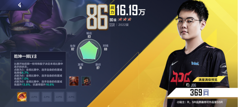 JDG队套由于369和yagao无法置换,所以剩下三个人中,Hope技能全场增益排第一,后期还有高输出。Kanavi强势入侵野区也很厉害,排第二。Missing的偷攻击力我绷不住了,有一点鸡肋。
