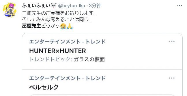 所以在三浦建太郎老师去世之后,不少网友也开始关心起了《全职猎人》的作者富坚义博。大家不希望《全职猎人》像《剑风传奇》一样因为作者的原因成为没有结尾的作品,在推特上,“富坚义博”和“全职猎人”的话题更是登上了热搜榜。