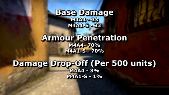 M4A1和M4A4的基础伤害都是33,面对护甲时也都衰弱为原来的70%,但是在距离衰减上M4A1只有1%的衰减,和AWP的距离衰减相同,是手游里衰减最低的;而M4A4有着3%的距离衰减。