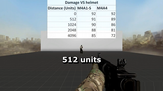 上图是,M4A1和M4A4击中带头盔的目标时,伤害随着距离衰减的对比,可以看到初始距离为0时两者的伤害都是92;随着距离增加到4096Units(手游中距离单位)时,M4A1衰减到85伤害,M4A4则衰减到72伤害,差距还是很大的。