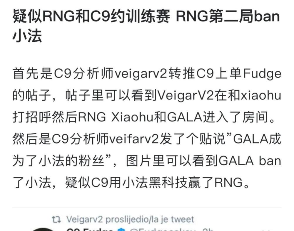 就在最近,C9战队的分析师意外曝光了rng战队和c9战队的训练赛。首先是C9分析师veigarv2转推C9上单Fudge的帖子,帖子里可以看到VeigarV2在和xiaohu打招呼然后RNG Xiaohu和GALA进入了房间。然后是C9分析师veifarv2发了个贴说”GALA成为了小法的粉丝”,图片里可以看到GALA ban了小法,疑似C9用小法黑科技赢了RNG。