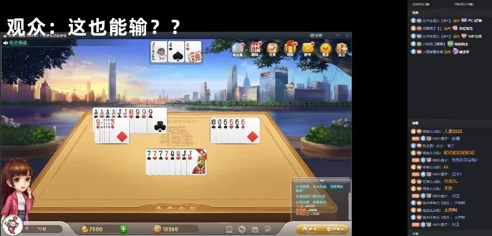 没想到佳哥居然跟两个对手,玩起了炸弹竞速,愣是把一手好牌给打输了!大量观众看他先输了一局lol,然后连斗地主都玩不明白之后,纷纷在弹幕上吐槽起了他的游戏技术,当有人问他:你为什么不四带两对时,他才一脸疑惑的表示:斗地主还能四带两对?