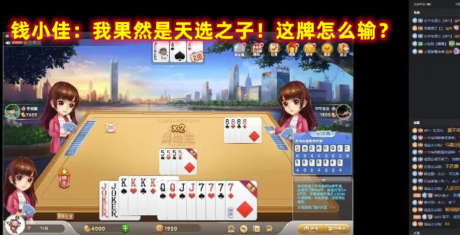 放出狠话的钱小佳,第一局游戏就拿到了一把非常完美的牌,抢下地主后的他,手握四个5、四个7、四个K和双王四只炸弹,按照常理来说,钱小佳只要开局来个四带两对,然后按顺序甩出三个炸弹,就能顺利获胜。